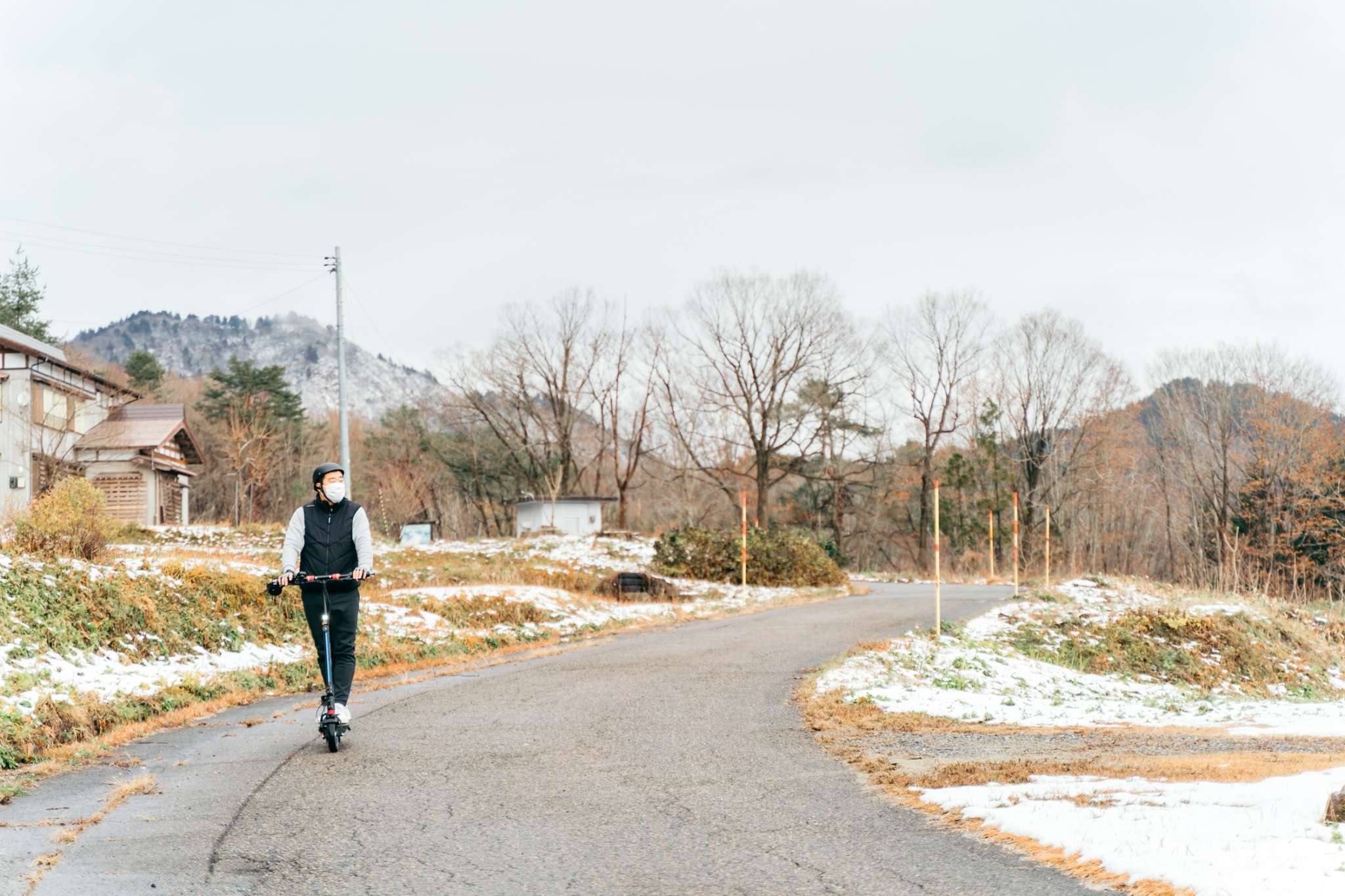 公道走行可能なキックボードで阿賀町を自由に走り回れる体験。山林、田んぼ道、路地裏、川沿いなどを軽快に走り抜けても良し、気軽に停めて写真を撮っても良し。車でも徒歩でもできない、快適な里山散策をどうぞ。
